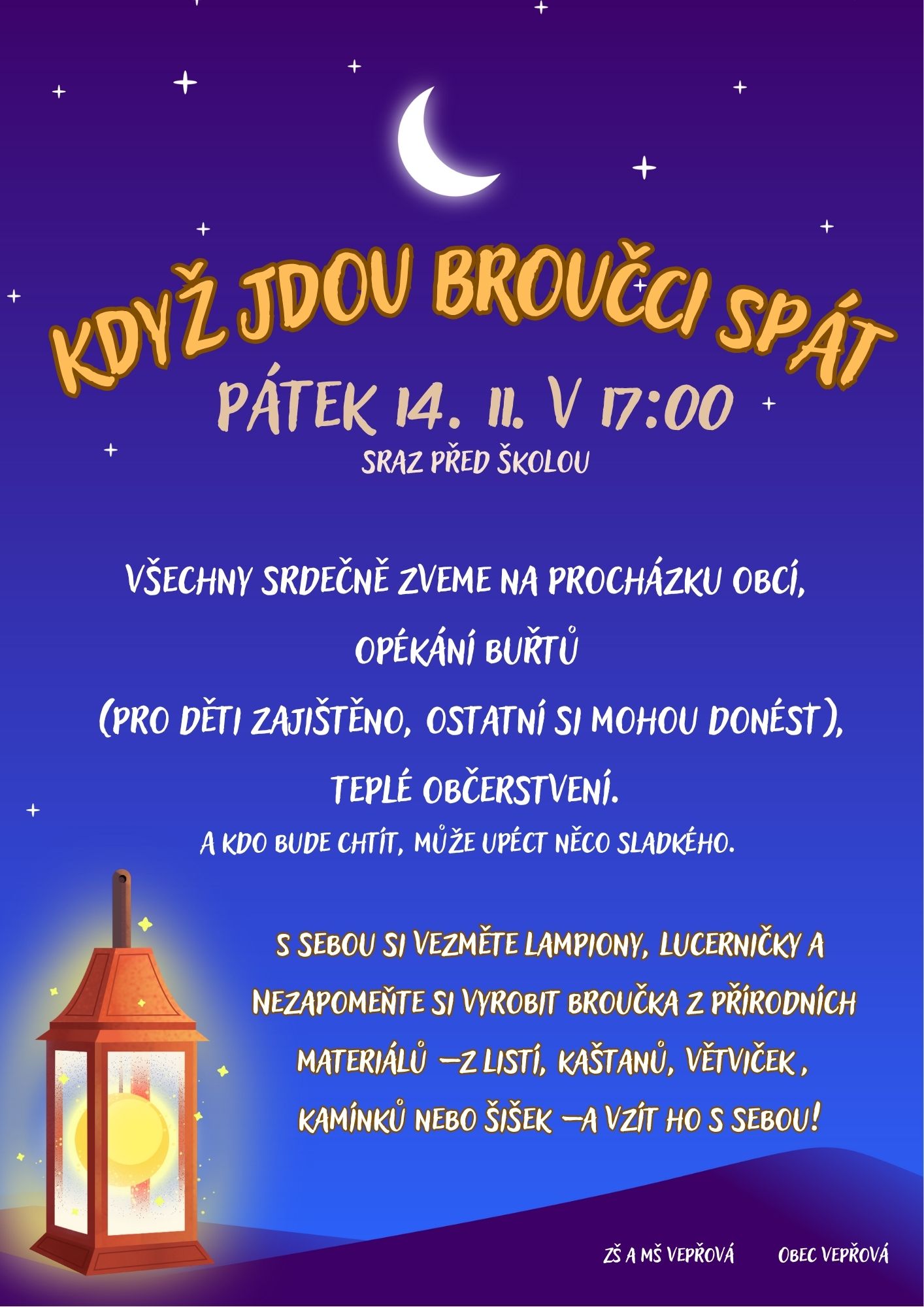 Základní a mateřská škola Vepřová spolu s Obcí Vepřová zve všechny v pátek 14.11.2025 na lampionový průvod s názvem " KDYŽ JDOU BROUČCI SPÁT ".